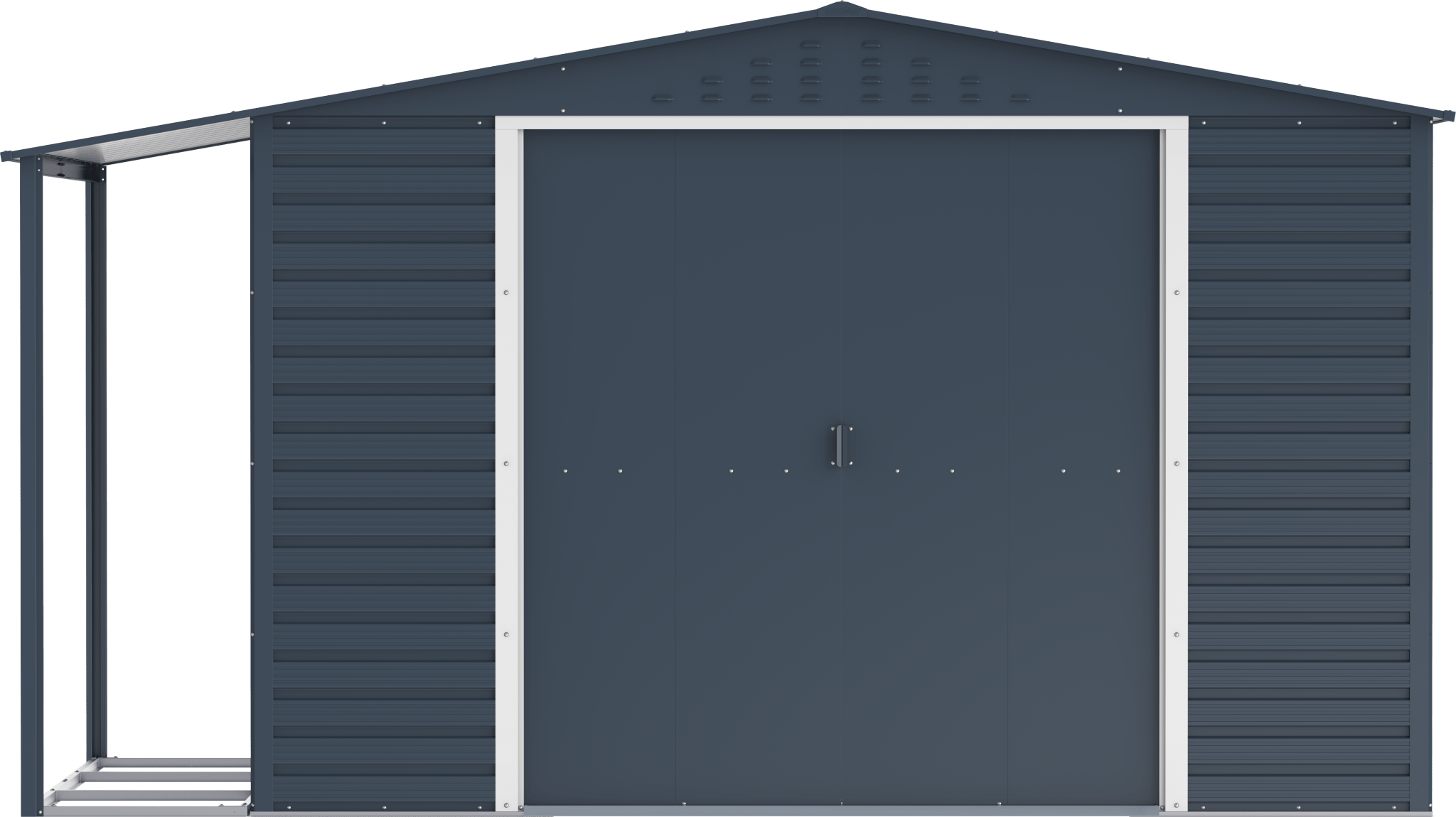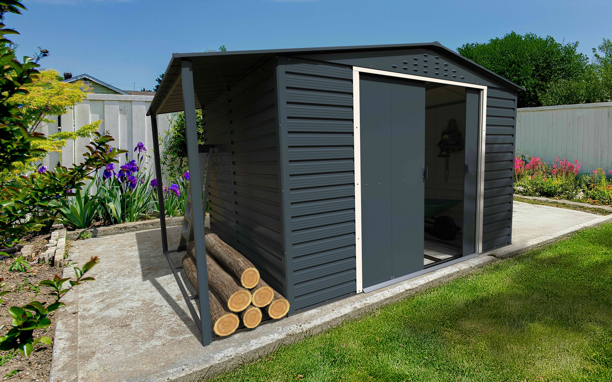 Este modelo permite añadir un kit de extensión lateral, instalable a la izquierda o a la derecha, que funciona como leñero metálico. Esta ampliación es ideal para almacenar leña, bicicletas, herramientas o artículos de jardín de forma ordenada y protegida. El leñero está fabricado en acero corrugado de 0,31 mm de grosor, ofreciendo una excelente resistencia al viento y a la intemperie. Su diseño frontal abierto favorece la circulación del aire, manteniendo la leña seca y en óptimas condiciones de uso.