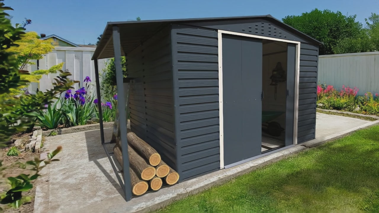 Las casetas de jardín Alpine de Duramax 10×10 con leñero en gris antracita ofrecen una solución segura, duradera y estéticamente cuidada para el almacenamiento exterior, combinando una caseta metálica robusta con un práctico espacio adicional para leña y organización del jardín.