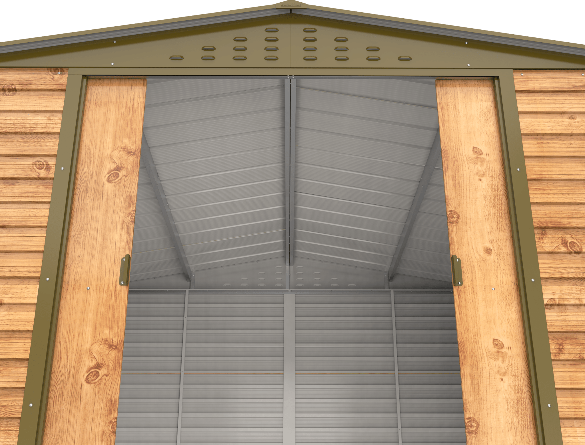 La condensación es uno de los problemas más habituales en las casetas de jardín metálicas. Alpine lo soluciona con un sistema de ventilación integrado discretamente en los hastiales delantero y trasero. Estos respiraderos permiten una correcta circulación del aire sin exponer el interior a la lluvia, reduciendo la humedad y evitando la acumulación de vapor.